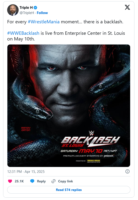 Backlash will take place on Saturday, May 10 at the Enterprise Center in Orton’s hometown of St. Louis. The 45-year old Orton signed a new five-year deal with WWE last year.