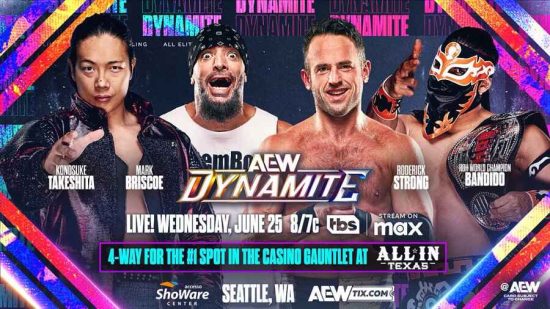 -4-Way for the No. 1 spot in the Men’s Casino Gauntlet at AEW All In Texas: Konosuke Takeshita vs. Mark Briscoe vs. Bandido vs. Roderick Strong.
