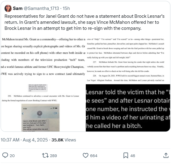 Lesnar is still named in the lawsuit by Grant, but only as a former UFC Champion and not by his actual name. In her suit, she alleges that she was offered to Lesnar sexually in order to entice him to sign a new WWE contract, while Vince McMahon was still CEO and chairman of the company.