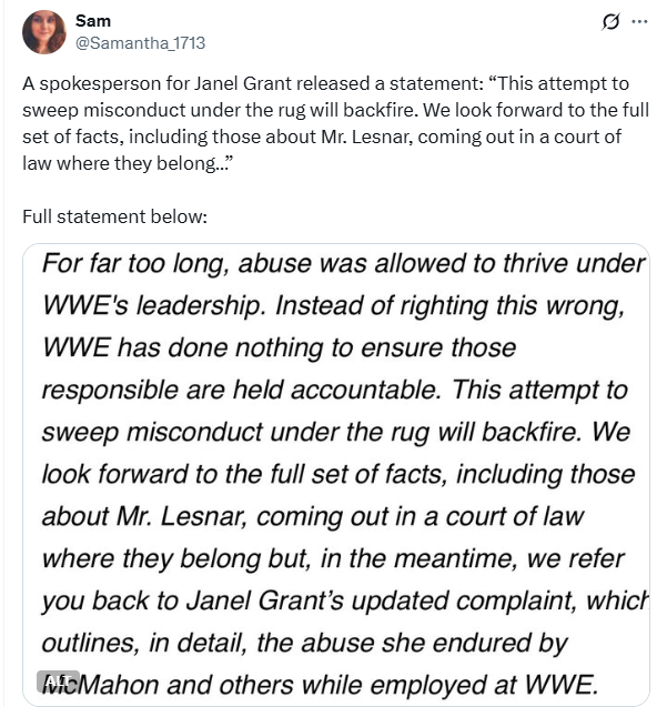 For far too long, abuse was allowed to thrive under WWE’s leadership. Instead of righting this wrong, WWE has done nothing to ensure those responsible are held accountable. This attempt to sweep misconduct under the rug will backfire. We look forward to the full set of facts, including those about Mr. Lesnar, coming out in a court of law where they belong but, in the meantime, we refer you back to Janel Grant’s updated complaint, which outlines, in detail, the abuse she endured by McMahon and others while employed at WWE.