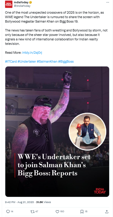 According to reports by India Today and Times of India, WWE Hall of Famer The Undertaker is being considered for a special wildcard entry into the India reality series Bigg Boss house later this season.