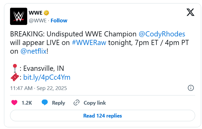 WWE has announced that Undisputed Champion Cody Rhodes will appear live at today’s episode of Raw, which takes place live from the Ford Center in Evansville, Indiana.