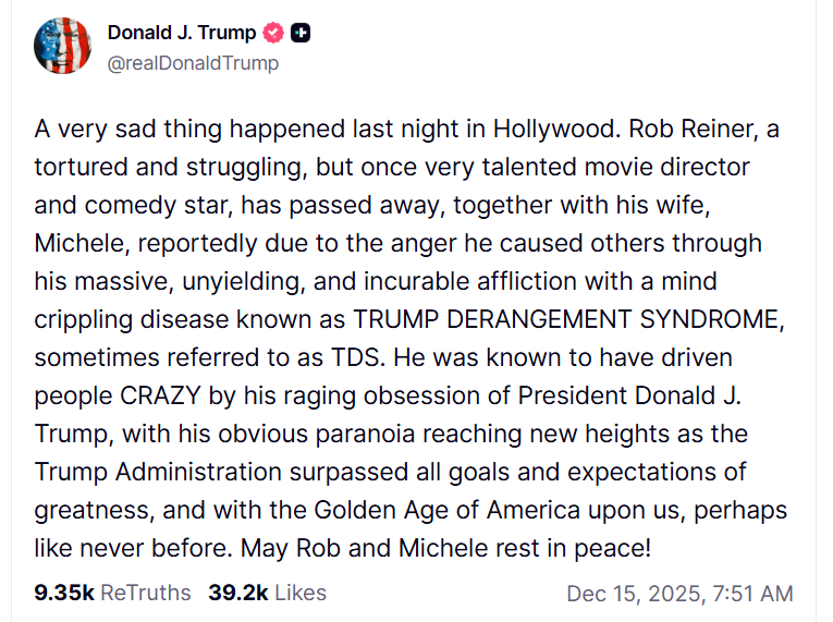 Trump’s comments from his Truth Social platform regarding the death of Rob Reiner and his wife Michele are below: