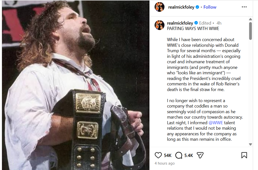 In his statement, Foley also said he will not be renewing his WWE Legends contract when it expires in June of 2026. He also said he will not be making any future appearances as a representative for WWE during the time Trump is in office. Foley called Trump’s comments about the death of film director Rob Reiner “incredibly cruel” and doesn’t know how anyone in WWE would support him.