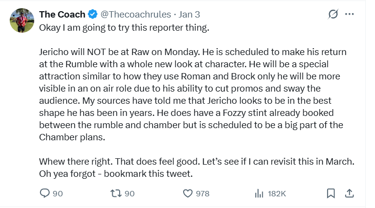 Former WWE backstage interviewer Jonathan Coachman said in a recent X post that Jericho will not be at tonight’s Raw and is that his sources say Jericho will make his return to WWE at the Royal Rumble with a whole new look.