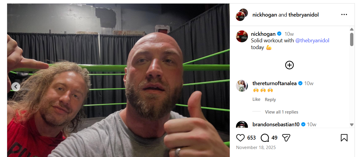 This past November, Hogan posted a picture on Instagram with himself and NWA talent Bryan Idol, noting he had a solid workout with Idol. There was then speculation that Nick could be training for a possible in-ring career.