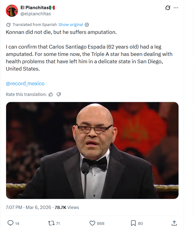 Book Pro Wrestlers on Facebook, the Record and other multiple sources are reporting that former WCW star and AAA creative team member Konnan, underwent surgery to amputate on of his legs due to severe medical complications.