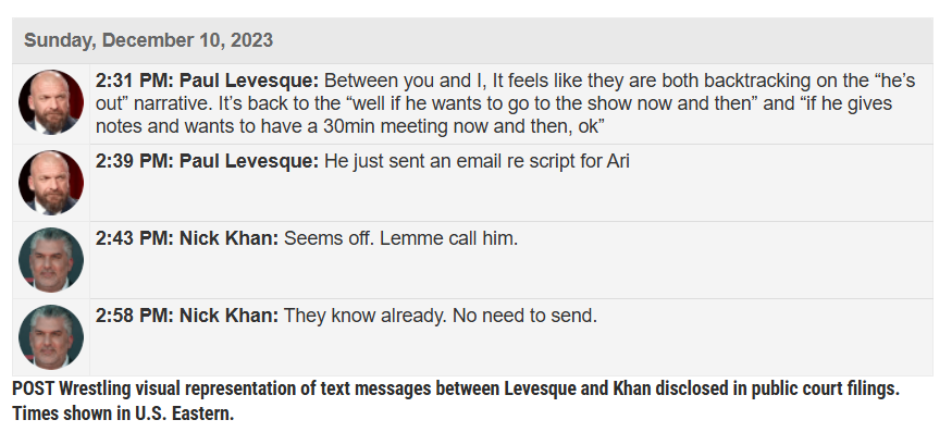 The messages show Levesque’s concern pertaining to friction with his father-in-law Vince McMahon. Levesque took over the role of head of creative the year prior, in addition to seeking support from Nick Khan, whom he reports to.