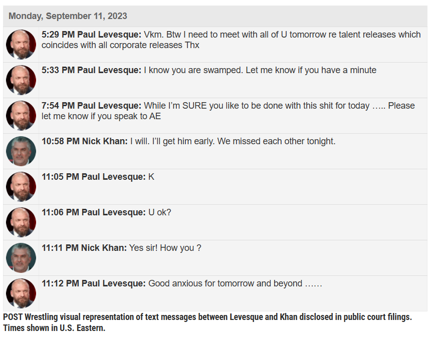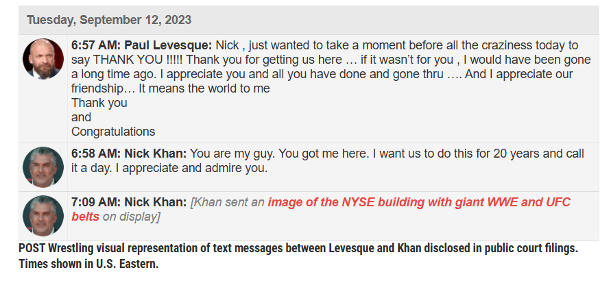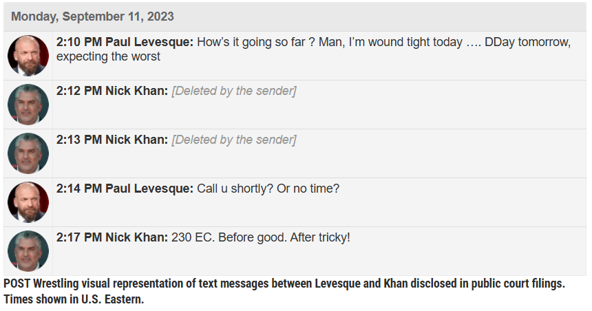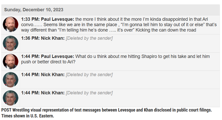 The next day, texts show Levesque telling Khan he was disappointed in a conversation with TKO CEO Ari Emanual. Khan again deleted his messages.