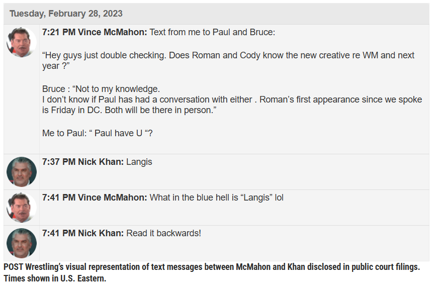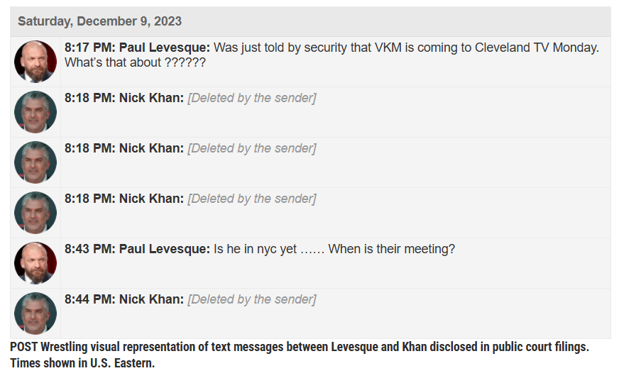 Fast-Forward two months – December 9, 2023, Levesque texted Khan about McMahon heading to TV in Cleveland, questioning what it’s all about.