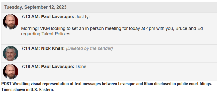 Then just a few minutes later, Levesque sent a message to Khan noting that McMahon wanted a meeting with Levesque and “Bruce and Ed,” which is believed to have been senior creative team members Bruce Prichard and Ed Koskey. Khan responded with a message, but then deleted it.