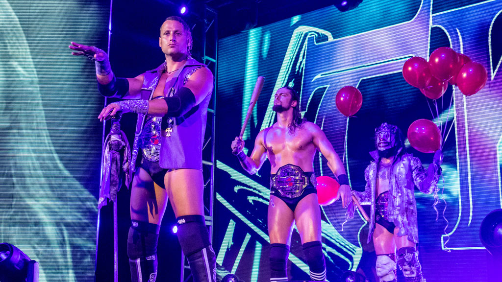 The champions seized control by isolating Matt Jackson, but Matt eventually tagged in his brother Nick, who ran wild on all three members of The Kingdom until Marseglia halted his momentum by popping a balloon in his ear. Taven then landed a springboard knee strike on Nick for a two count.