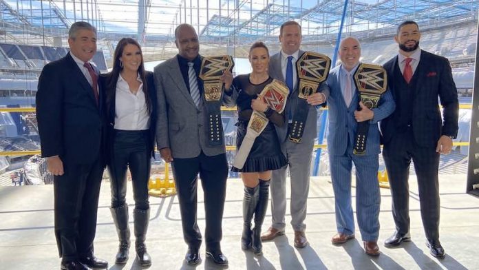 .@WWE Chief Brand Officer @StephMcMahon along with #Raw Women’s Champion and @WWERomanReigns present WWE Championships to dignitaries @SoFiStadium home of @WrestleMania pic.twitter.com/wec2K7FMrq