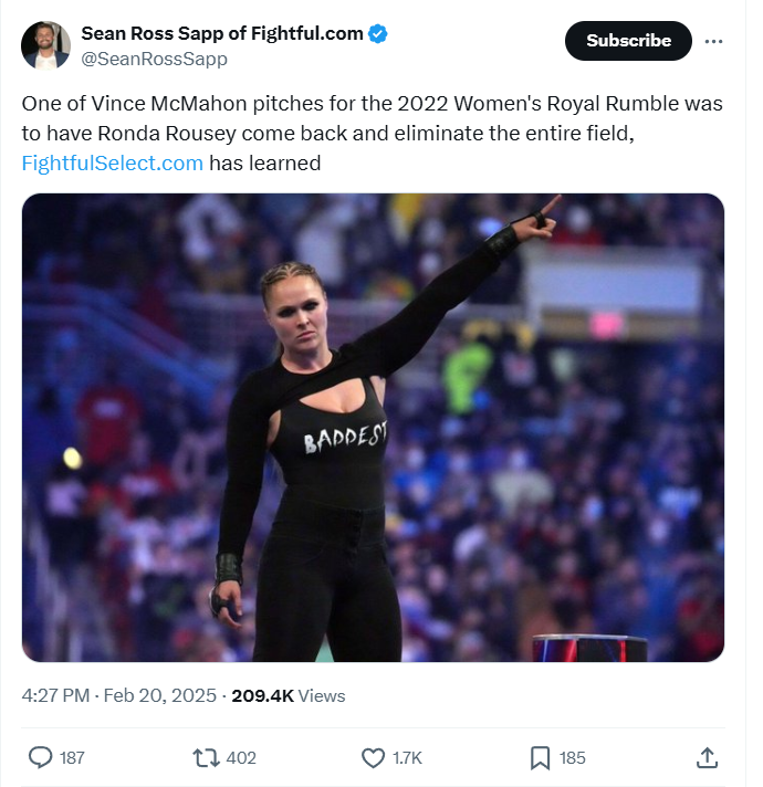 Fightful Select has a new report about one of Vince McMahon’s pitches for the 2022 WWE Royal Rumble, involving now former WWE Superstar Ronda Rousey.