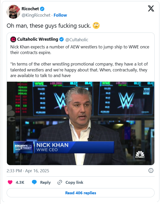 Ricochet responded to Khan’s comments regarding AEW and interest in their talent once they become free agents. the former WWE United States and Intercontinental Champion said that his former employer f—– sucks.