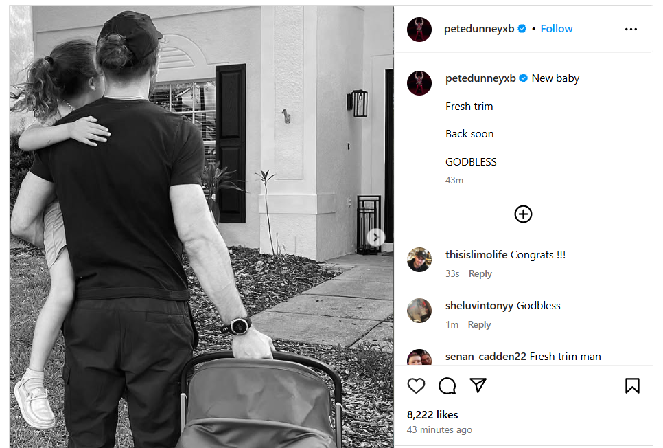 In the caption of the photo Dunne wrote, “New baby. Fresh trim. Back soon. GODBLESS.”