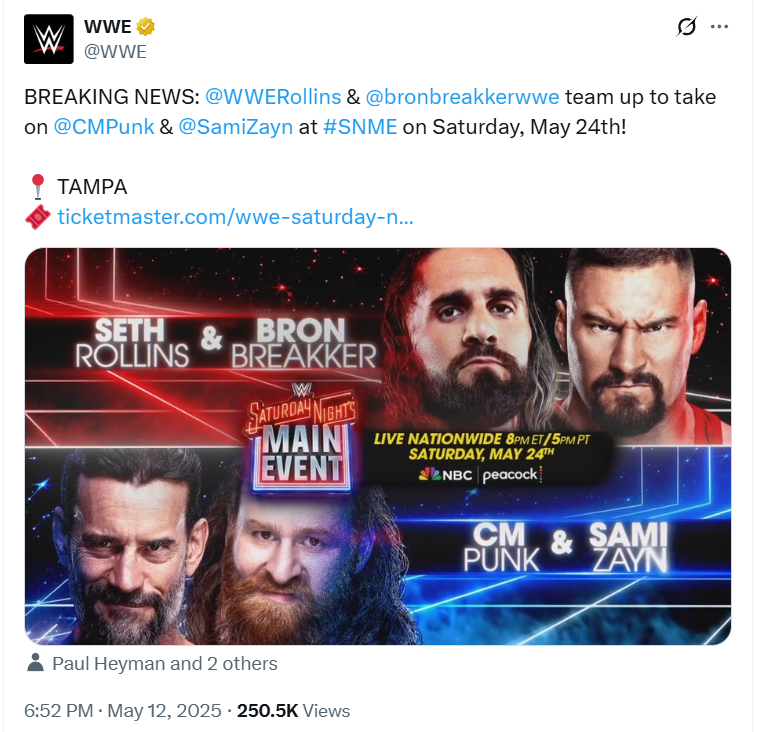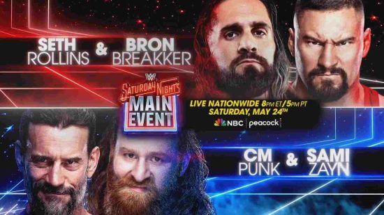 Following a brawl on Monday’s WWE Raw, it was made official that CM Punk and Sami Zayn will square off against Seth Rollins and Bron Breakker at Saturday Night’s Main Event on May 24.