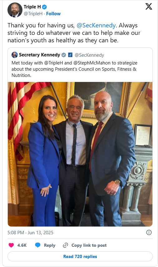 Stephanie McMahon and WWE Chief Content Office Triple H met with United States Secretary of Health and Human Services Robert F. Kennedy Jr. on Friday, to discuss strategies for the upcoming President’s Council on Sports, Fitness & Nutrition.