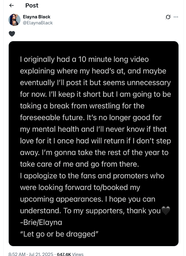In a statement posted on social media, Elayna Black revealed she would be taking a break from wrestling for the foreseeable future.
