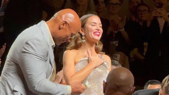 The film’s co-star Emily Blunt, who plays the love interest of Mark Kerr (played by Johnson), was standing beside Johnson during the applause.