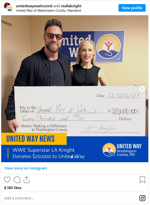 WWE Superstar LA Knight made a $20,000 donation to the United Way in his hometown of Washington County, Maryland.
