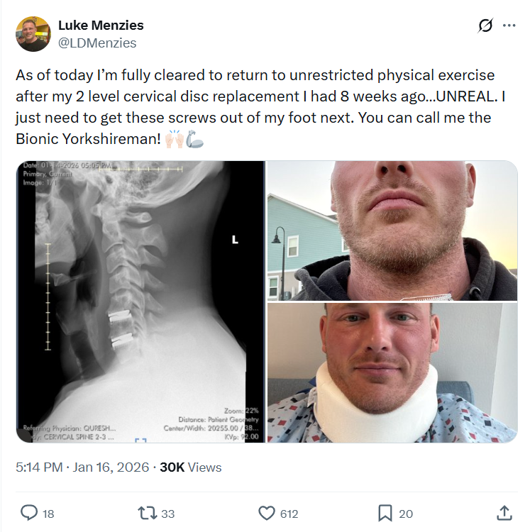 “As of today I’m fully cleared to return to unrestricted physical exercise after my 2 level cervical disc replacement I had 8 weeks ago…UNREAL. I just need to get these screws out of my foot next. You can call me the Bionic Yorkshireman!”