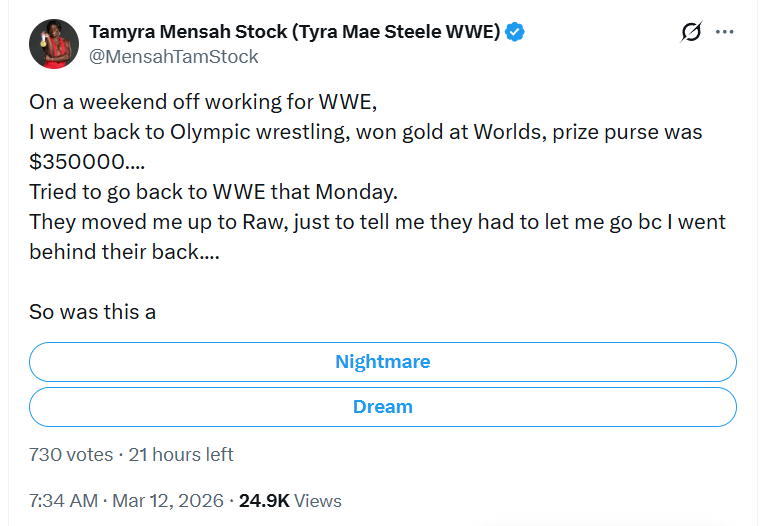 Olympic Gold Medalist Tyra Mae Steele (real name Tamyra Mensah Stock), announced on her social media that she has been let go by WWE.