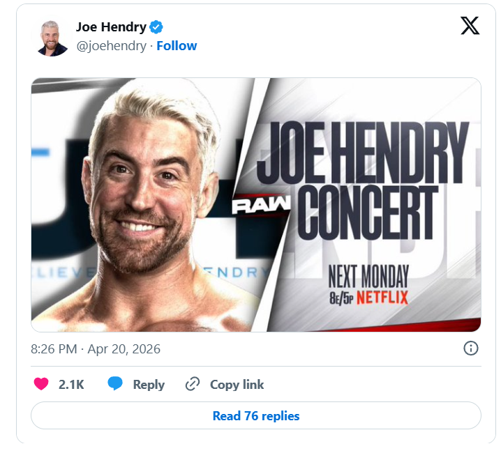 WWE announced during Monday’s Raw, that Joe Hendry will make his debut on next week’s episode with a concert. Hendry dropped the NXT Championship to Tony D’Angelo at Stand & Deliver back on April 4, having only held the title for 60 days.