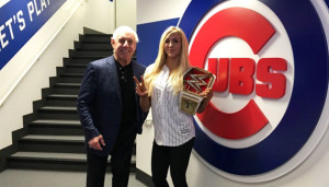 WWE Women’s Champion Charlotte throws out the first pitch before a Chicago Cubs game before Payback