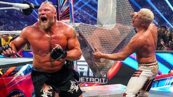 Lesnar shakes his head as Rhodes gets to his knees and looks him in the eyes. Lesnar clubs the back, but Rhodes responds with some stiff right hands to the midsection. Lesnar shakes it off and hits an overhead belly-to-belly suplex. The side of Rhodes’s ribs are absolutely scraped up. Rhodes looks stunned, but he still pulls himself up in the corner. Lesnar grabs him, but Rhodes holds the ropes. Lesnar rips him away, and the top turnbuckle pad comes off. Lesnar hits a German Suplex. Rhodes gets out of the ring and grabs the ring steps, but Lesnar boots them out of his hands. Rhodes fights back and drives him into the ring post! Rhodes hits Lesnar with the ring steps and gets him in the ring! Rhodes hits a Disaster Kick followed by a Cody Cutter! Rhodes jumps off the middle rope to the top rope and hits a second Cody Cutter for a near fall!